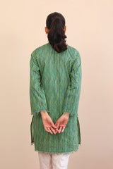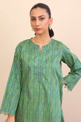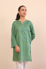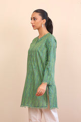A printed shirt with short hems, round neck with slit and frayed hems of sleeves.