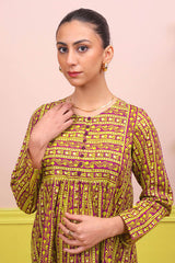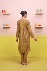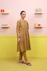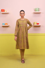 Printed flared shirt with fabric detail on bodice, stitched pleats, full length sleeves and round neckline with fabric buttons. Paired wth printed slim-fit trousers.