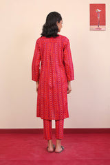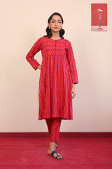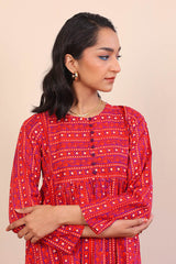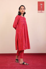 Printed flared shirt with fabric detail on bodice, stitched pleats, full length sleeves and round neckline with fabric buttons. Paired wth printed slim-fit trousers.