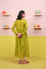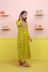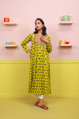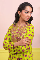 Multi-printed shirt with contrasting fabric, stitch detail and mukaish highlights on bodice. Stitched pleats, straight sleeves and round neckline.