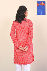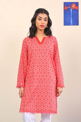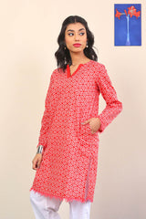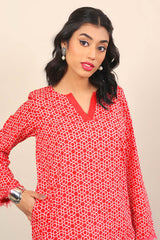 Printed straight shirt with pockets on sides and frayed hem and sleeves with round neckline with solid fabric V dip.