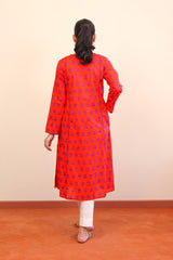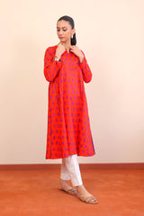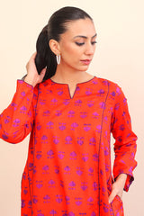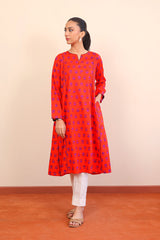 Panelled flared shirt with pockets on sides, straight sleeves and round neckline with V dip.