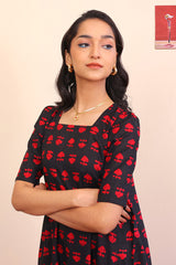 Loose-fit long printed shirt with puffed half sleeves and square neckline. Paired with printed slim-fit trouser.