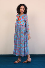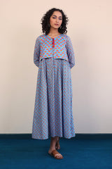 Flared, printed long dress with gatehr details and koti with tassel dori.