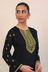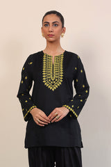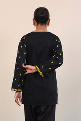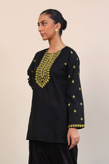 Short panelled kurti with embroidery on neckline and miniature floral motifs on sleeves.Sizes 8, 10 & 12 are 31" in length and 14 & 16 are 33" in length.
