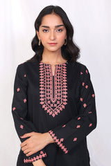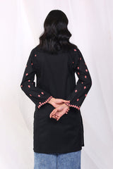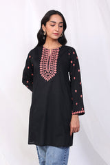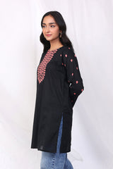Medium length panelled kurti with embroidered neckline and motifs speckled on sleeves.