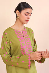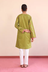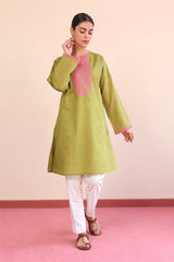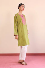 Medium length panelled kurti with embroidered neckline and motifs speckled on sleeves. Sizes 8, 10 & 12 are 36" in length and 14 & 16 are 38" in length.