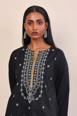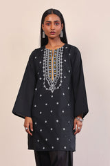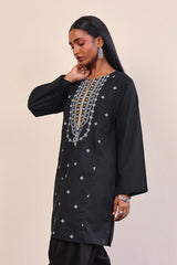 Medium length, panelled kurti with embroidery details on neckline and all over the front. izes 8, 10 & 12 are 36" in length and 14 & 16 are 38" in length.