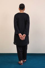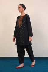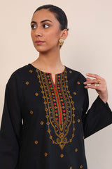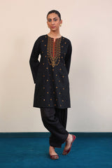 Medium length, panelled kurti with embroidery details on neckline and all over the front. izes 8, 10 & 12 are 36" in length and 14 & 16 are 38" in length.