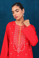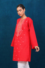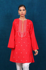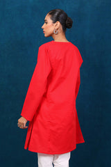 A short kurti with full sleeves and round neckline and embroidered motifs on front.
