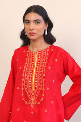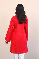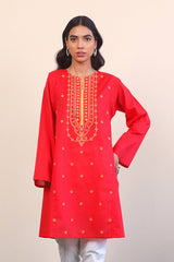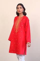 A short kurti with full sleeves and round neckline and embroidered motifs on front.