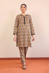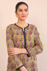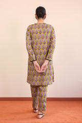 A long printed shirt with round neckline with dip, embroidery on neckline with full sleeves. Paired with straight trousers.