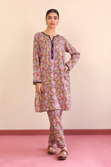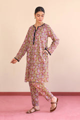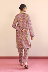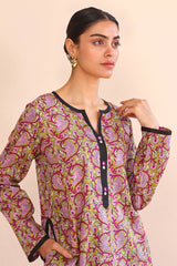 A printed long straight shirt, round neck with open V, solid color piping details with foil embellishment on placket and pockts. Paired with straight trousers.
