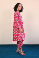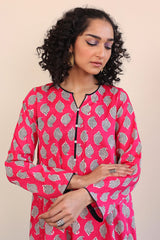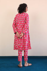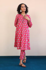 A long panelled shirt with a round neck with V neckline with buttons on placket, and full sleeves, paired with cigarette pants.