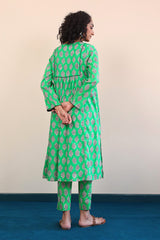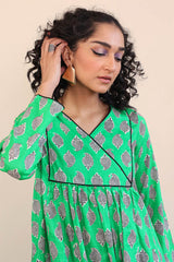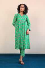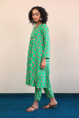 A long shirt with pleats on torso with piping design on front, V shaped neckline and full sleeves. Paired with straight pants.
