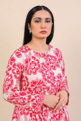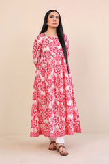 A long printed dress with buttons on placket, full sleeves and voluminous flare.