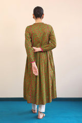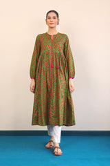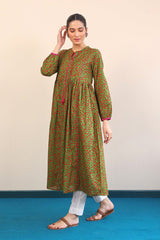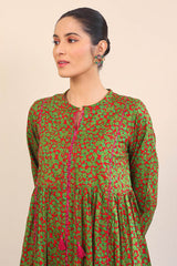 A long dress with crew neck and tassels on front and cinched sleeves.