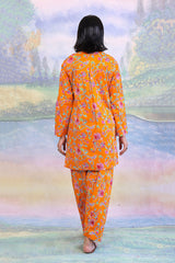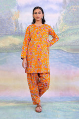 Printed round neckline kurta with button details on placket, Paired with classic fit shalwar.