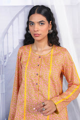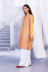 A long straight printed shirt with round neck, buttons on placket and piping details.