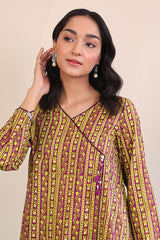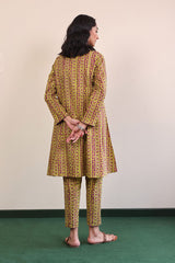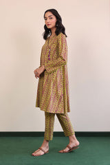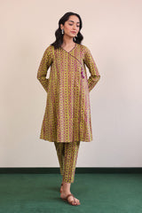 Angrakah neckline A-line shirt with side tassels, paired with straight fit matching pants.