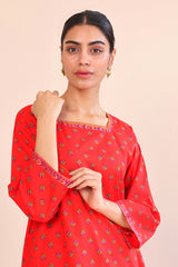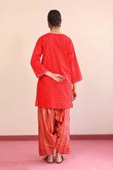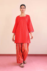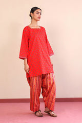 Iridescent printed short kurti with three quarter sleeves and square neckline, paired with a contrast print shalwar.