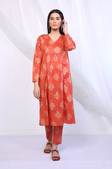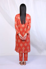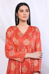 A long jaquard shirt with pleats on front and V shaped neckline, paired with matching printed straight trousers.