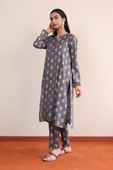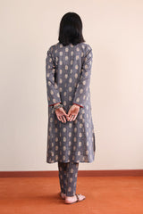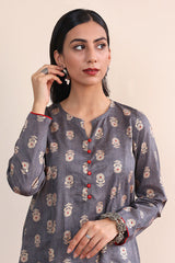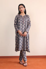 A long A-line shirt with jaquard pattern all over, full sleeves and buttons on placket with foil details. Paired with straight fit pants.-Model is wearing size 8 and height is 5' 7''