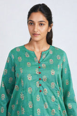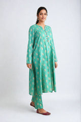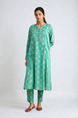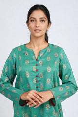 A jaquard pattern straight long shirt with with foil embellishments on placket and straight fit pants.