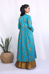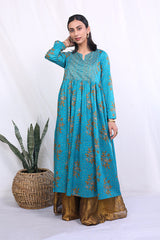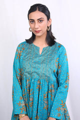 Print blocked flared dress with gathers and hints of mukaish on bodice.