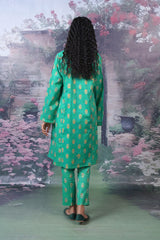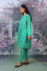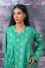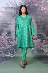 A jaquard pattern shirt with A-line shape with panels, paired with matching straight pants.