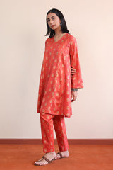 A-line, panelled printed kurta with V-neckline. Paired with straight fit pants.