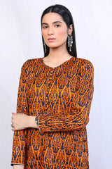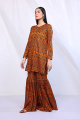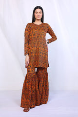 A short printed shirt with round neck and fabric buttons on front, paired with a matching voluminous gharara.