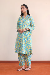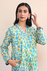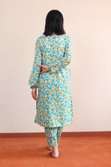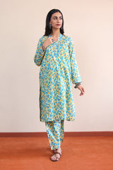 A printed long shirt with V shaped neckline and piping details with full sleeves. Paired with a printed shalwar.-Model is wearing size 8 and height is 5' 7''