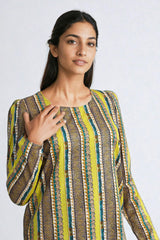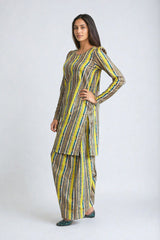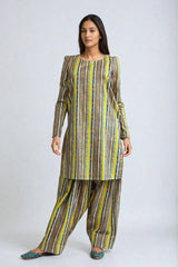 A short shirt with boat neckline, puffed long sleeves, paired with a matching shalwar.