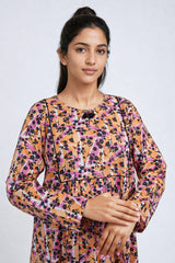 A printed shirt with flare details on front and piping details. Paired with straight trousers.