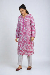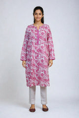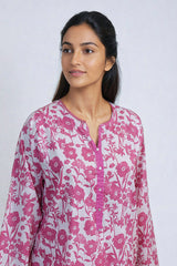 A printed kurta with round neck with V shaped dip with buttons on neckline.