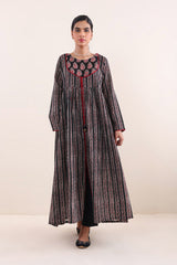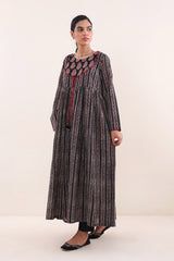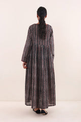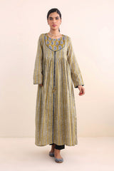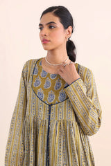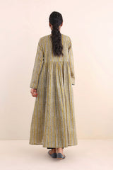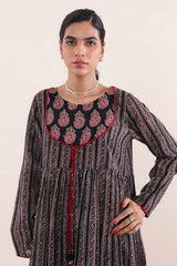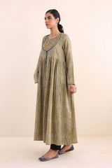 Print blocked ajrak flared dress with gathers and tassel dori details.
