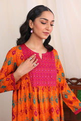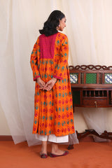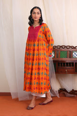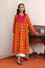 Print blocked flared dress with with gathers and mukaish details on bodice.