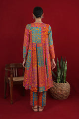 Printed flared shirt with gather details, adorned with tassel details. Paired with straight fit pants.