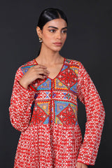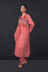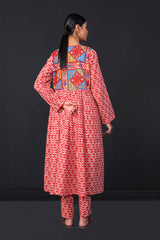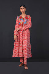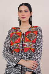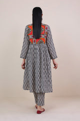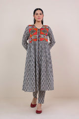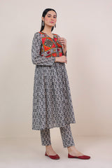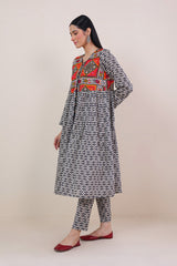 Front open print blocked flared shirt with gather details and buttons. Paired withstraight fit pants.