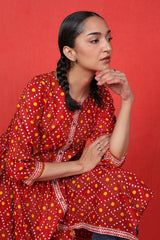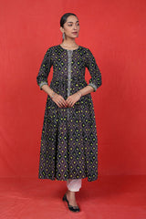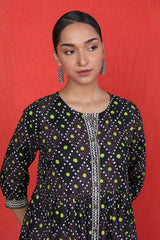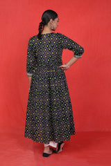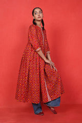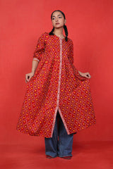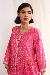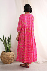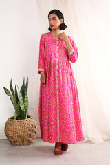 Printed front open flared dress with round neckline and gathers and buttons on front placket.