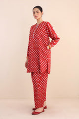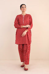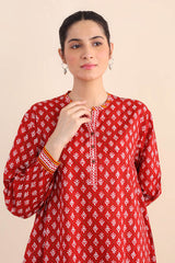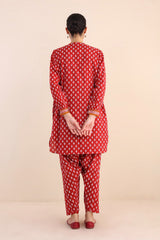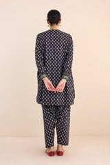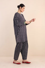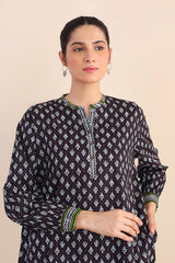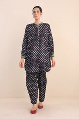 Printed kurta with round hemline, and buttons on placket and cuff sleeves. Paired with classic fit printed shalwar.