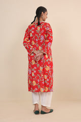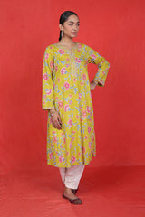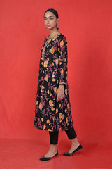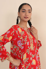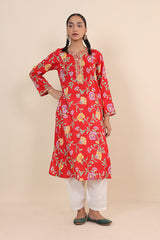 A printed shirt with dory work detailing on the neckline and sleeve hem.