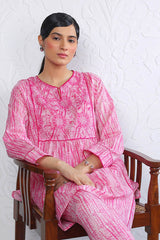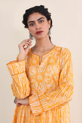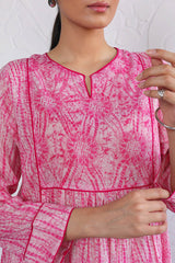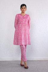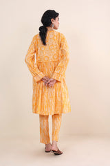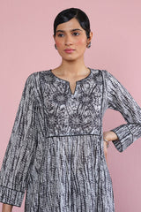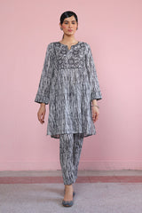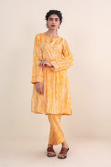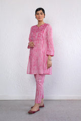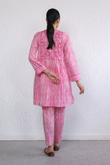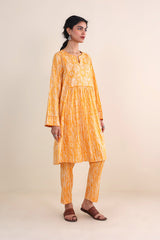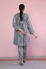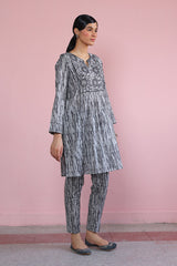 Printed kurta with fish zig zag stitch details on neckline and sleeves, paired with loose fit printed pants.