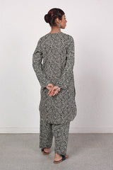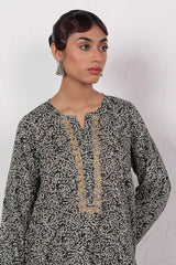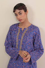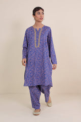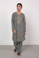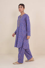 Dive into style with our midnight hues printed kurta with star sparkling dori embroidery details. Paired with matching classic fit shalwar.