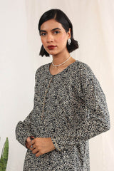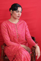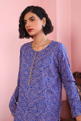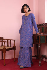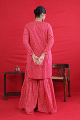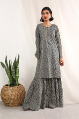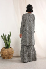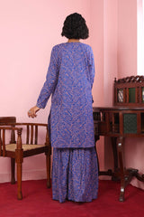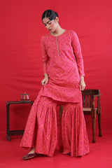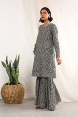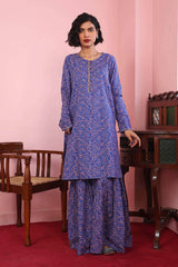 Printed kurta with round neckline, along with dory work and button on the placket. Paired with a matching gharara.