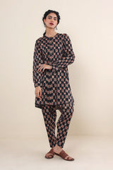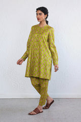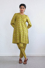 Printed, front open shirt with puff sleeves and buttons on placket.