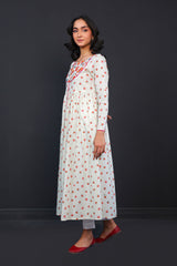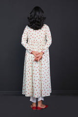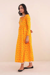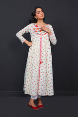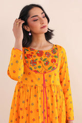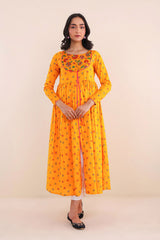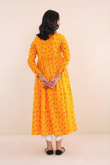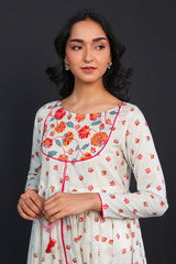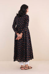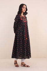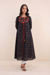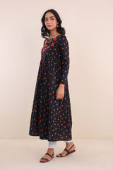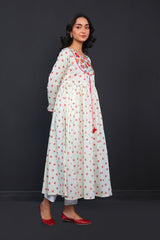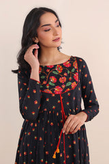 Print blocked flared dress with bib neckline, gathers and tassel dori.