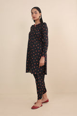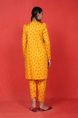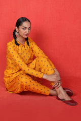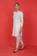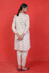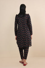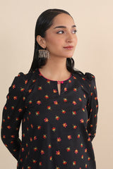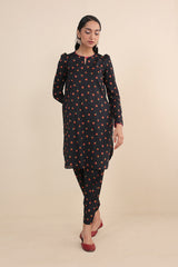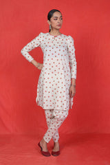 The ultimate floral printed kurti with puff sleeves, paired with khari/pegged printed shalwar for a modern twist.