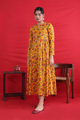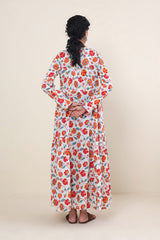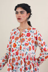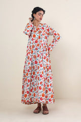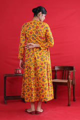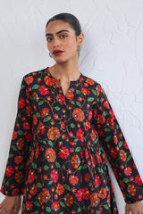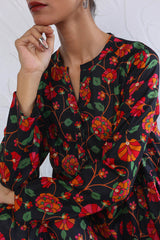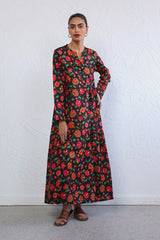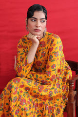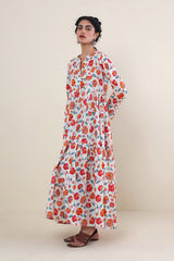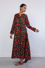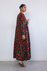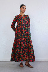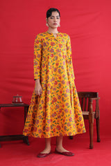 Printed, flared tiered dress with button details.